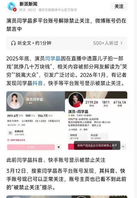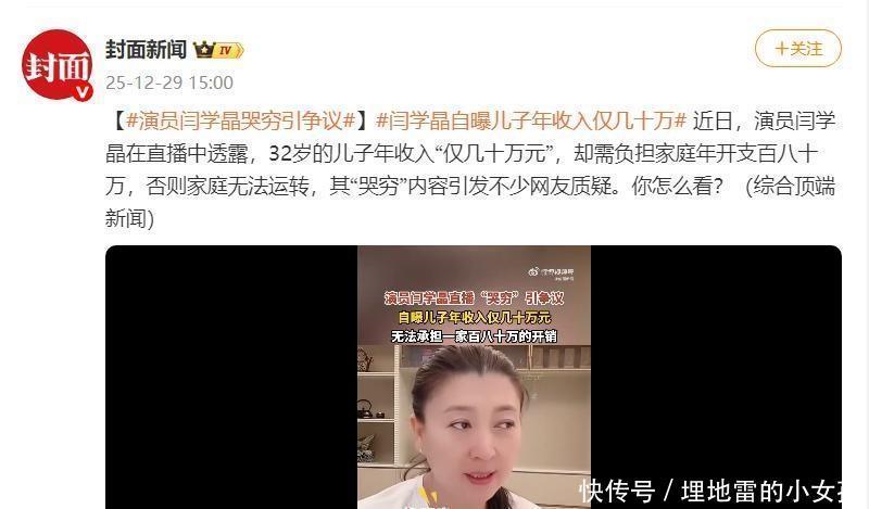阅读此文之前,麻烦您点击一下"关注",既方便您进行讨论和分享,又能给您带来不一样的参与感,感谢您的支持!None从全网噤声到悄然“解封”,从“人人喊打”到网友口中的“年度最冤”,闫学晶这两个多月的经历,简直比她演过的所有苦情戏都更抓马。你说这世道奇不奇怪?一个在荧幕上演了大半辈子“苦命好人”的老戏骨,差点在现实里,被几张截图、几段拼接的视频,活活给“演”没了。还记得去年底那场面吗?闫学晶在直播间里随口感慨了句“儿子年收入才几十万,家里开支上百万”,好家伙,瞬间就被扣上了“哭穷卖惨”、“何不食肉糜”的大帽子。紧接着,账号直接被平台“禁止关注”,等于嘴被彻底捂上了。那之后,什么“中戏院长落马是她害的”、“她儿子是特权班保送”、“直播教训农民忘本”……各种谣言像病毒一样疯传。那阵势,真是墙倒众人推,破鼓万人捶,好像不跟着骂两句,就显得自己不够“清醒”似的。可真相呢?它虽然总爱迟到,但从不缺席。咱们今天就掰开揉碎了说说,闫学晶这“三宗冤”,到底冤在了哪儿。